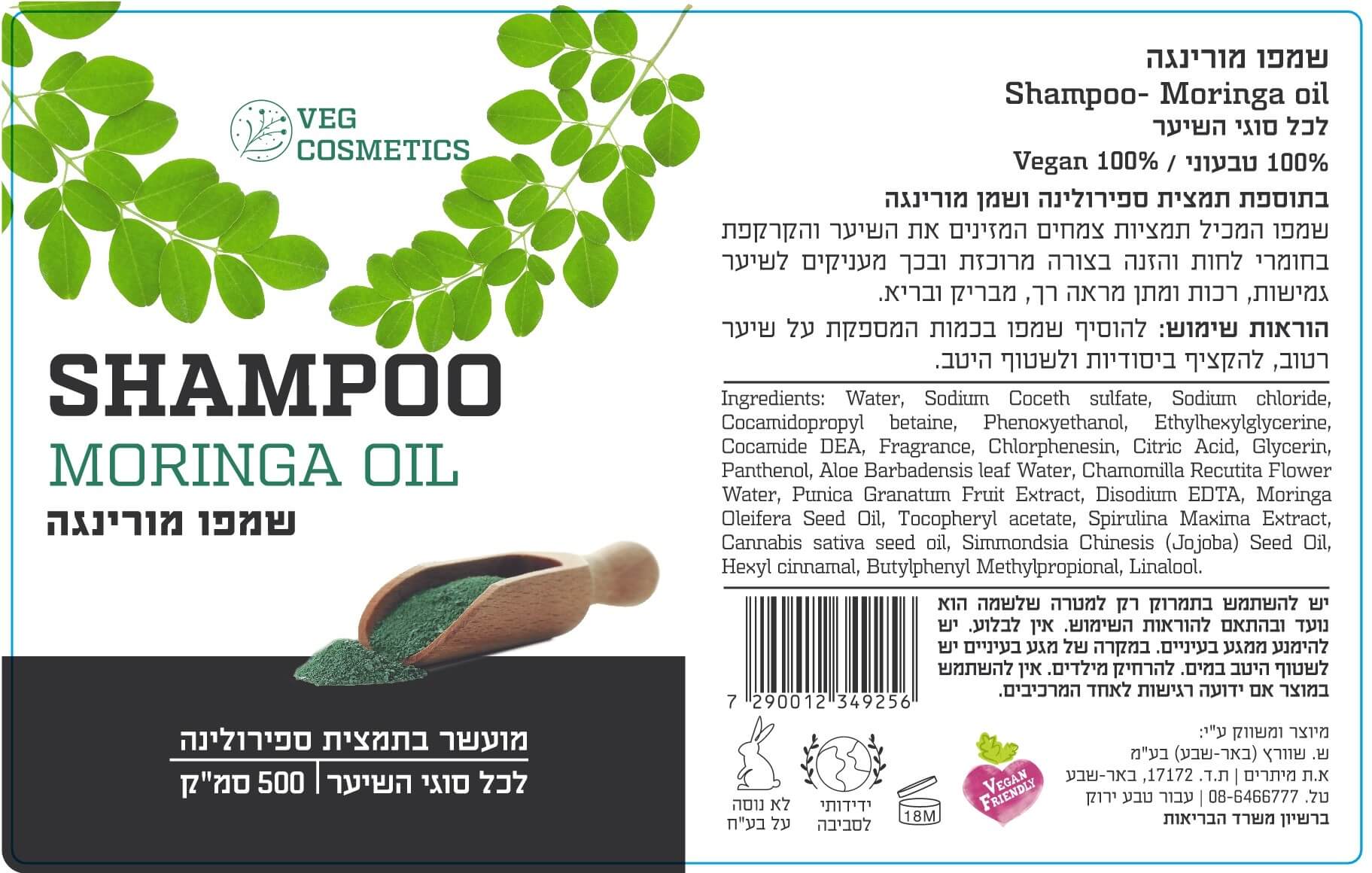 שמפו מורינגה טבעוני מועשר בתמצית ספירולינה 450 מ”ל|Veg cosmetics