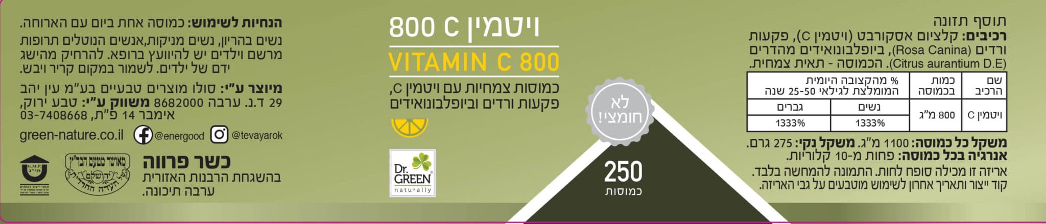 ויטמין C 800 -לא חומצי בתוספת ביופלבונואידים ופקעות ורדים 250 כמוסות | VITAMIN C